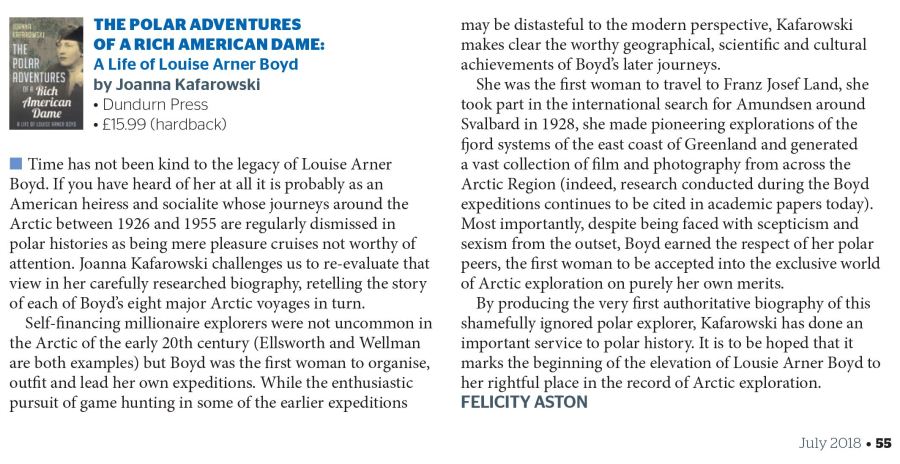 “Thanks to Joanna Kafarowski’s biography, Louise Arner Boyd can no longer be ignored in accounts of the history of polar research.”