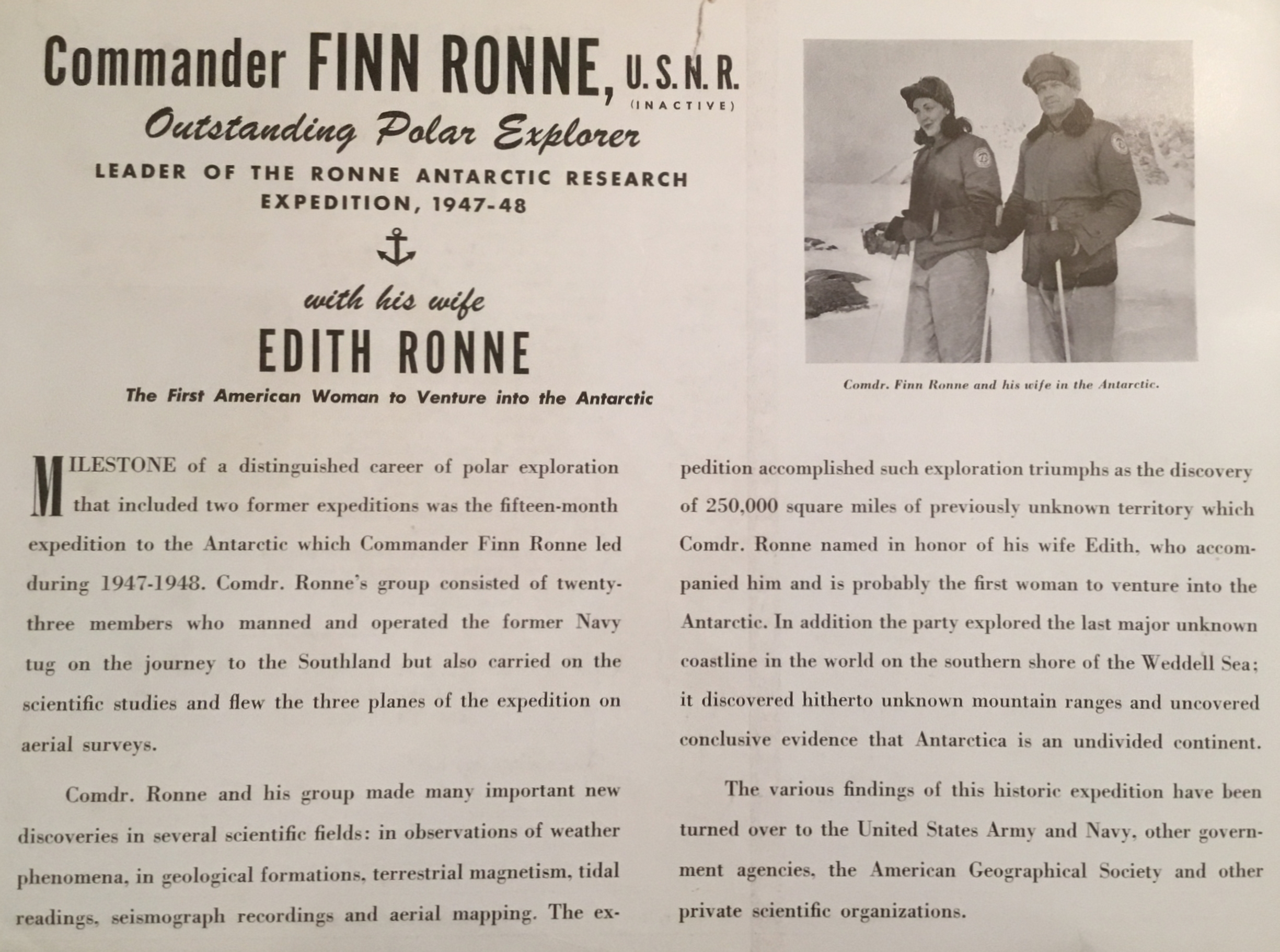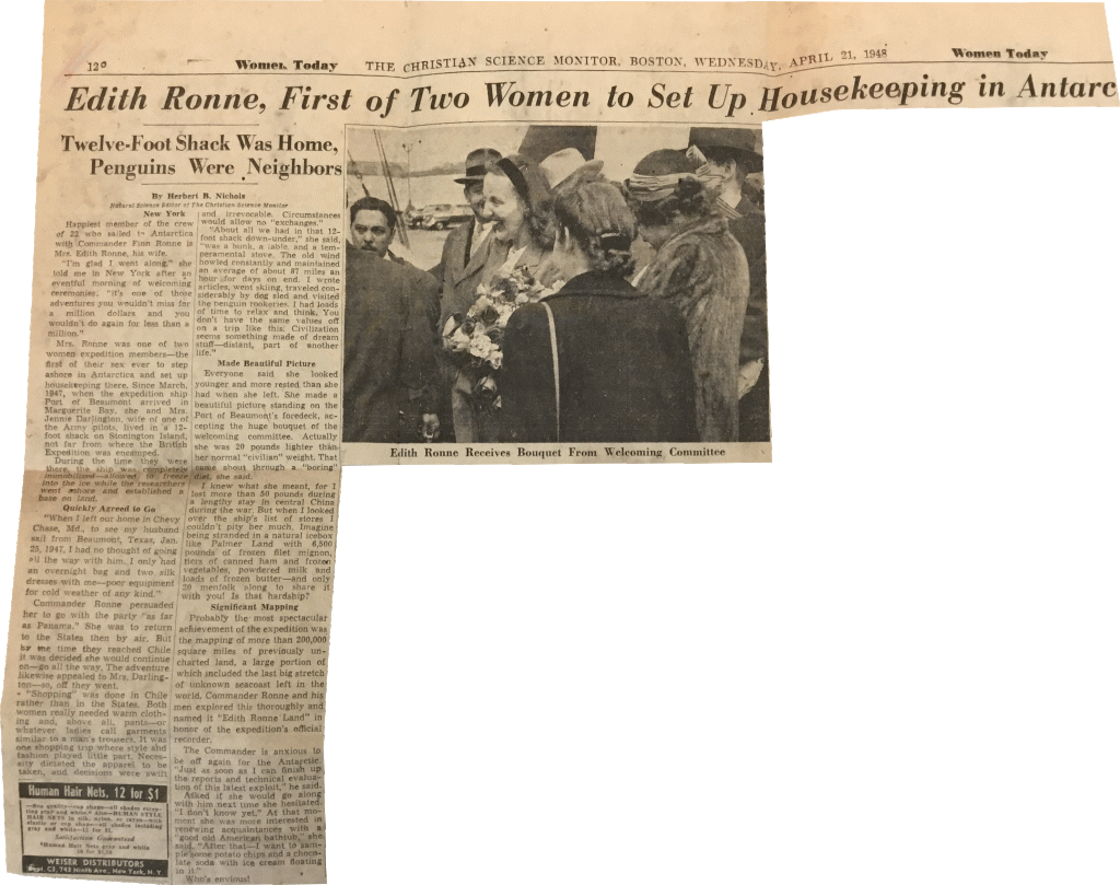 Christian Science Monitor, April 21, 1948 “Edith Ronne, First of Two Women to Set Up Housekeeping in Antarctica”